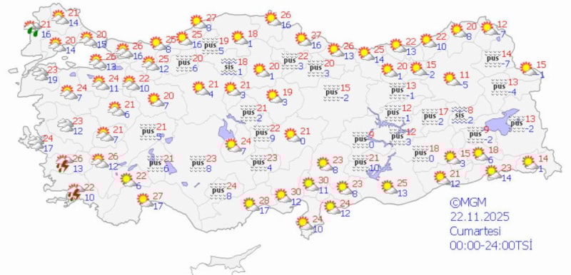 Hafta sonu için beklenen hava durumuna ilişkin değerlendirmelerde bulunan Çevre, Şehircilik ve İklim Değişikliği Bakanlığı Meteoroloji Genel Müdürlüğü Hava Tahmin Uzmanı Fevzi Burak Tekin, yurdun büyük bir bölümünde hafta sonu az bulutlu ve açık bir havanın görüleceğini, gece ve sabah saatlerinde iç kesimlerde yer yer sis ve pusun etkili olacağını söyledi.
