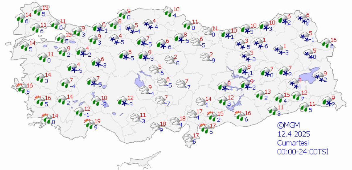 Kıyı kesimlerde ile Marmara ve Güneydoğu Anadolu'da yağmur ve sağanak, yağış alan diğer yerlerde karla karışık yağmur ve kar şeklinde görülmesi beklenen yağışların, Rize ve Trabzon ile Giresun'un doğu kesimlerinde yer yer kuvvetli olması bekleniyor.