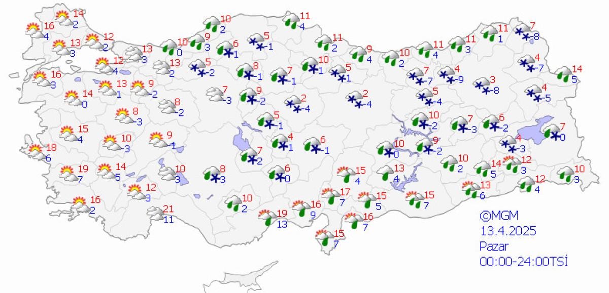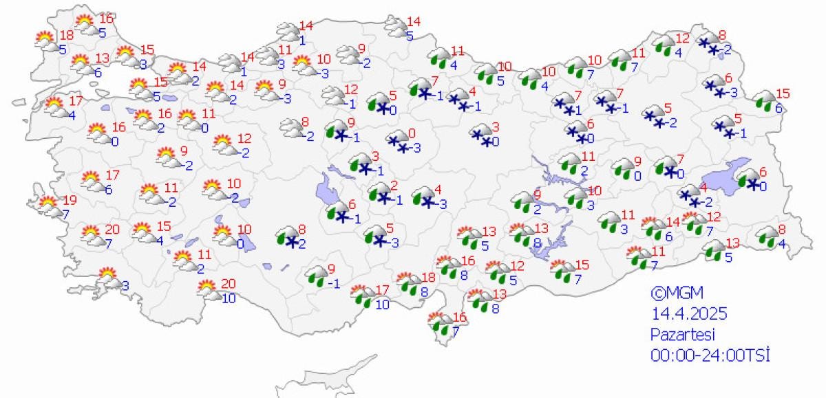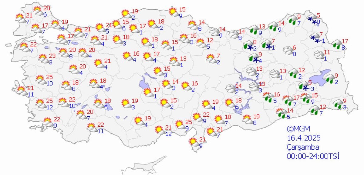 Önümüzdeki hafta ortasına kadar sıcaklıklar, Ankara'da 16, İstanbul'da 19, İzmir'de 21, Antalya'da 25, Adana'da 25, Diyarbakır'da 16, Samsun'da 14 dereceye kadar yükselecek.