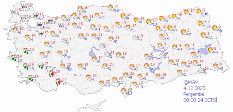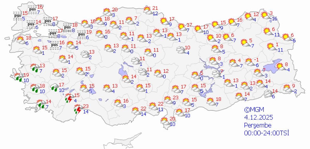 Ege Bölgesi: Kuzey kesimlerde yağmur etkili, kıyılarda puslu hava.