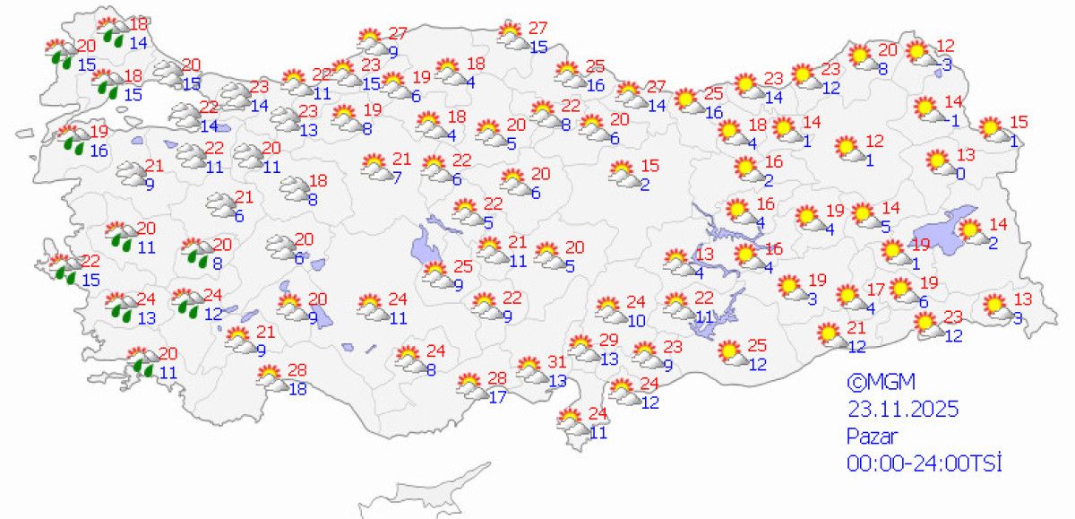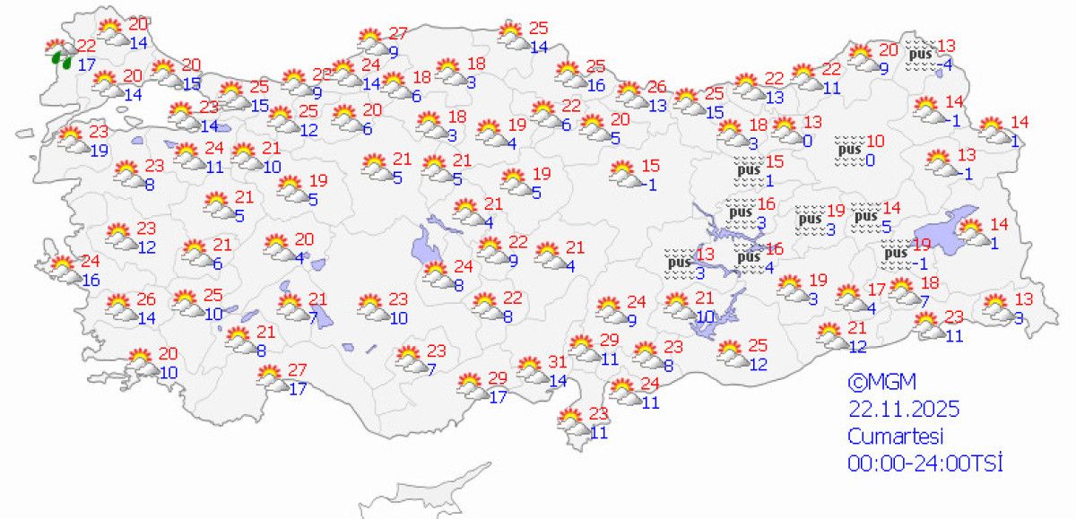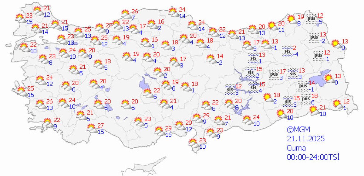 - Ülke genelinde parçalı ve az bulutlu hava hakim olacak, batı bölgelerinde hafif sağanak ve pus görülebilir.