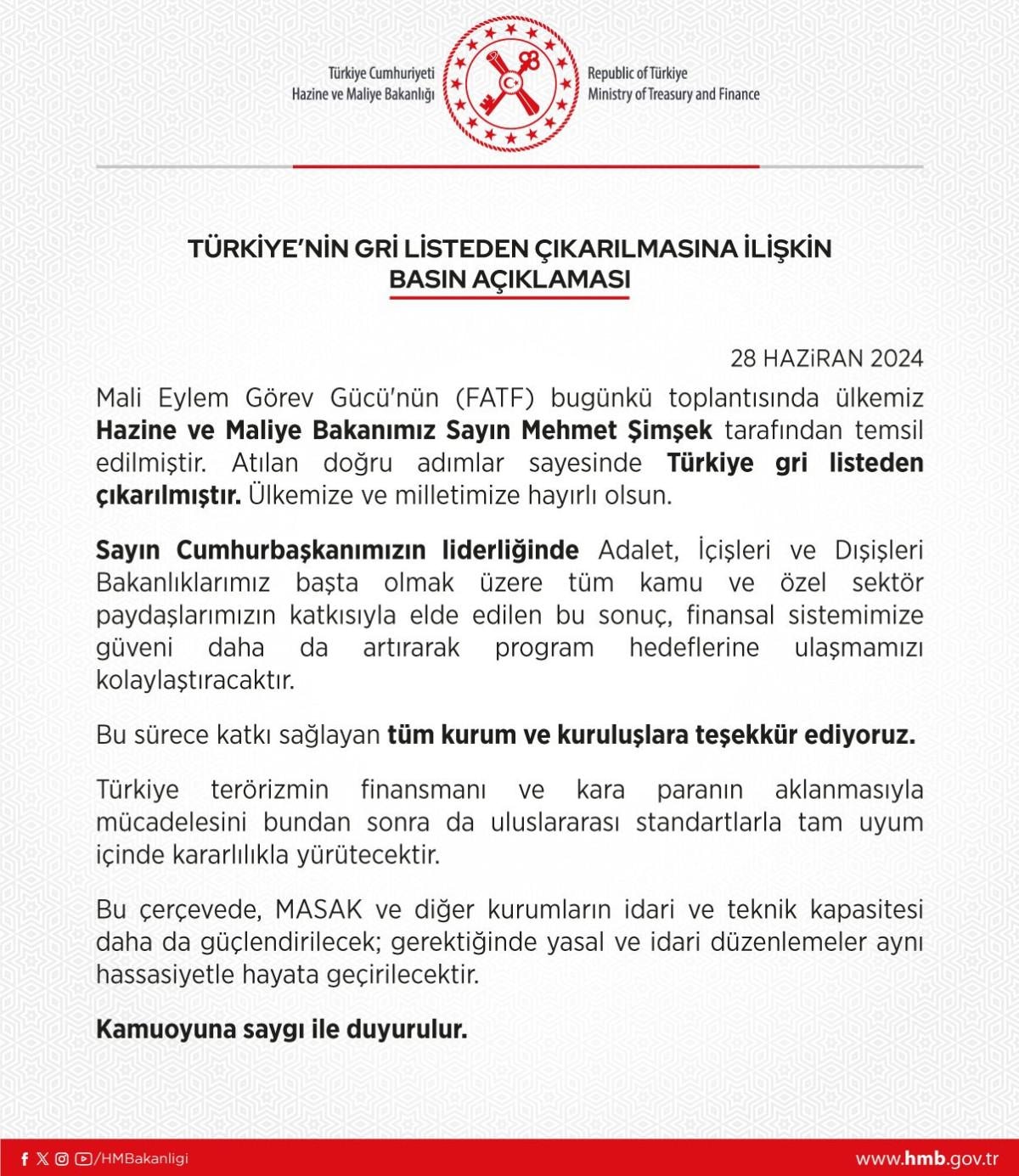 "Mali Eylem Görev Gücü'nün (FATF) bugünkü toplantısında ülkemiz Hazine ve Maliye Bakanımız Sayın Mehmet Şimşek tarafından temsil edilmiştir. Atılan doğru adımlar sayesinde Türkiye gri listeden çıkarılmıştır. Ülkemize ve milletimize hayırlı olsun. Sayın Cumhurbaşkanımızın liderliğinde Adalet, İçişleri ve Dışişleri Bakanlıklarımız başta olmak üzere tüm kamu ve özel sektör paydaşlarımızın katkısıyla elde edilen bu sonuç, finansal sistemimize güveni daha da artırarak program hedeflerine ulaşmamızı kolaylaştıracaktır. Bu sürece katkı sağlayan tüm kurum ve kuruluşlara teşekkür ediyoruz. Türkiye terörizmin finansmanı ve kara paranın aklanmasıyla mücadelesini bundan sonra da uluslararası standartlarla tam uyum içinde kararlılıkla yürütecektir. Bu çerçevede, MASAK ve diğer kurumların idari ve teknik kapasitesi daha da güçlendirilecek; gerektiğinde yasal ve idari düzenlemeler aynı hassasiyetle hayata geçirilecektir."