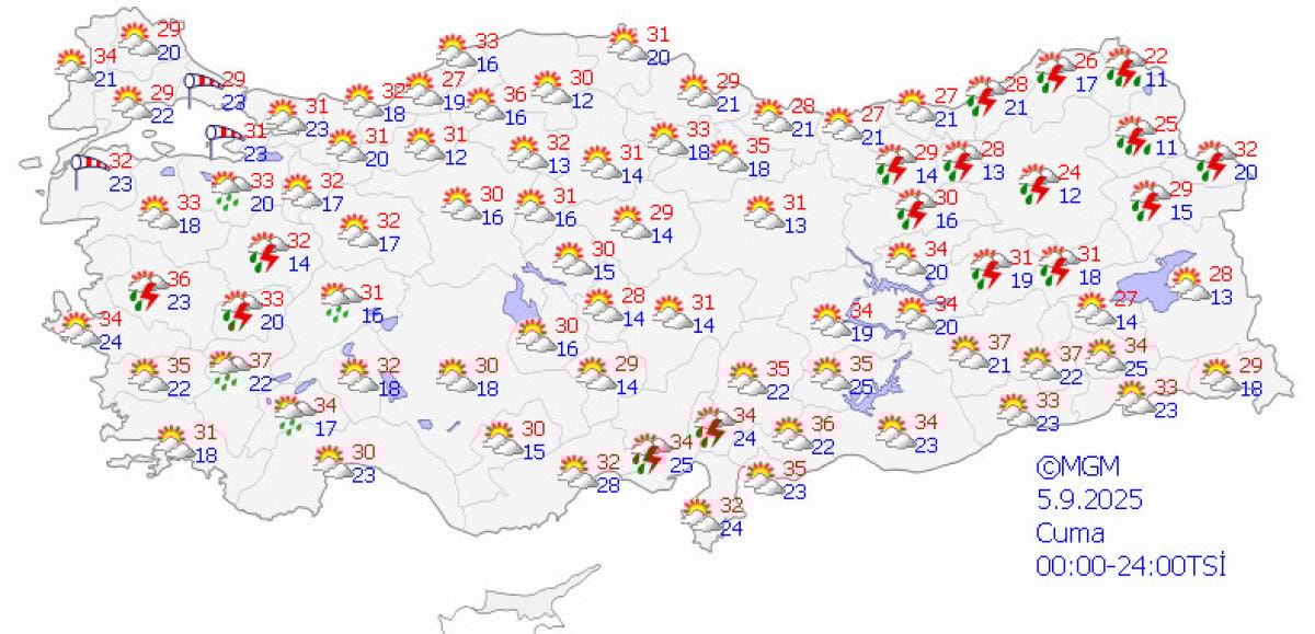 Tekin, hafta sonu yurt genelinde parça parça yağışların görüleceğini belirterek cuma günü İç Ege, Doğu Akdeniz, Doğu Karadeniz, Doğu Anadolu'nun kuzeydoğusu ile Bursa ve Bilecik'te sağanak yer yer gök gürültülü sağanakların görüleceğini bildirdi.
