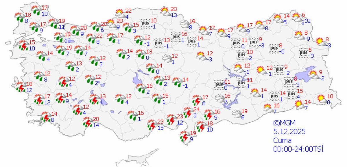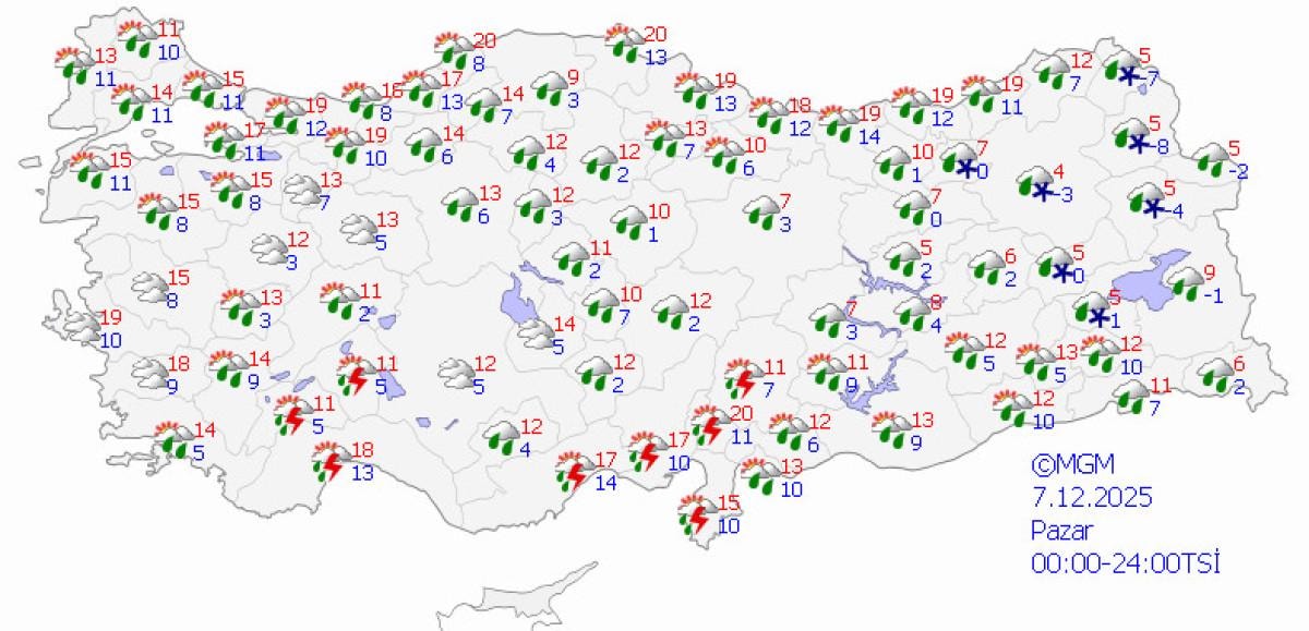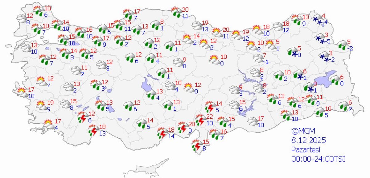 - Marmara, Ege ve Karadeniz bölgelerinde şiddetli yağışlar öngörülüyor; doğuda karla karışık yağmur ihtimali bulunuyor.