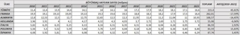 2010-2023 yılları arası dikkate alındığında Türkiye, büyükbaş hayvan yetiştiriciliğinde diğer ülkeleri geride bıraktı. 2010 yılında Fransa yaklaşık 20 milyon büyükbaş varlığıyla bu alanda Avrupa’da lider konumdayken, Almanya 13 milyon adetle ikinci sırada, Türkiye ise 11,4 milyon sayısıyla üçüncü sırada yer alıyordu.
