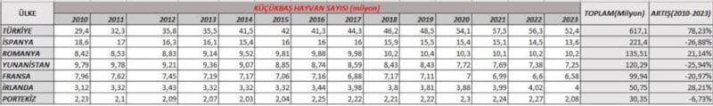 Türkiye, 2010-2023 yıllarını kapsayan dönemde küçükbaş hayvan varlığında Avrupa ülkelerinden pozitif ayrıştı.