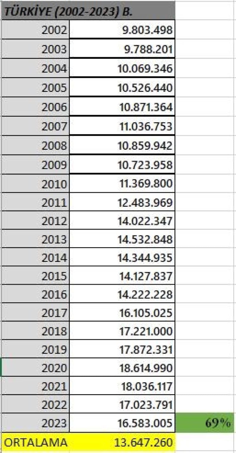 Öte yandan Türkiye'de et üretimi rakamlarına bakıldığında, 2002 yılında 620 bin 541 ton olan toplam et üretimi, 2023'te 2 milyon 384 bin 47 ton olarak hesaplandı.