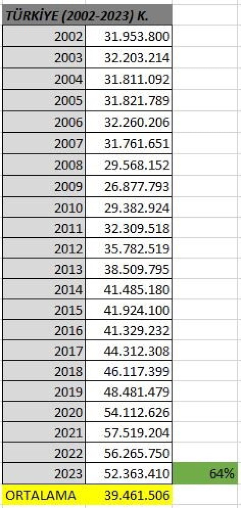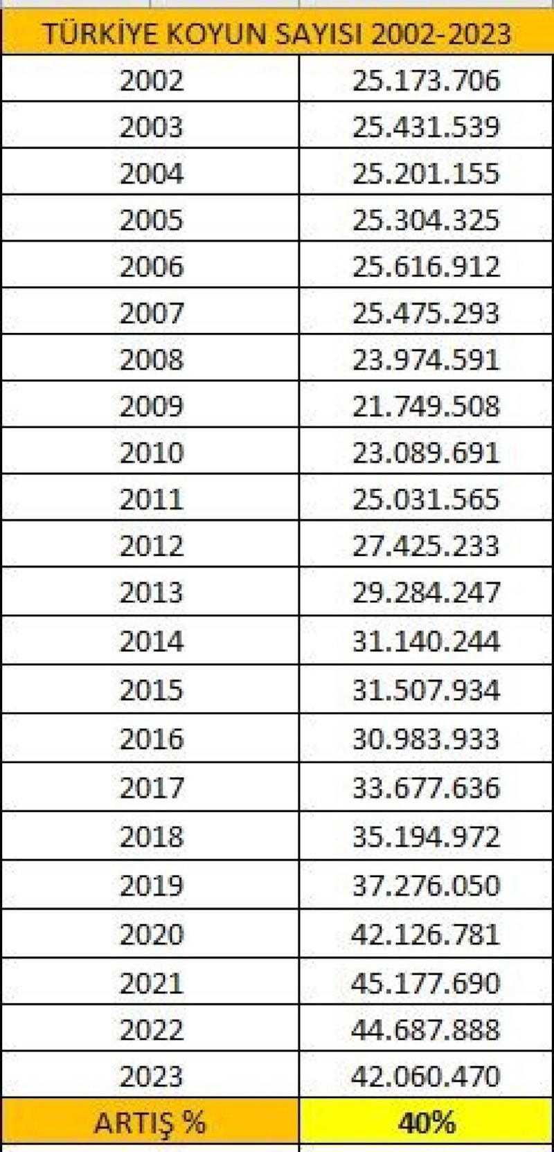 2002 yılında 25,2 milyon olan koyun sayısı geçtiğimiz yıl itibarıyla 42 milyonu aştı. Türkiye’nin koyun sayısı AB ülkelerindeki toplam koyun sayısının yüzde 60’ına denk geliyor. AB ülkelerinin toplamı yaklaşık 70 milyon koyun varlığına sahip.