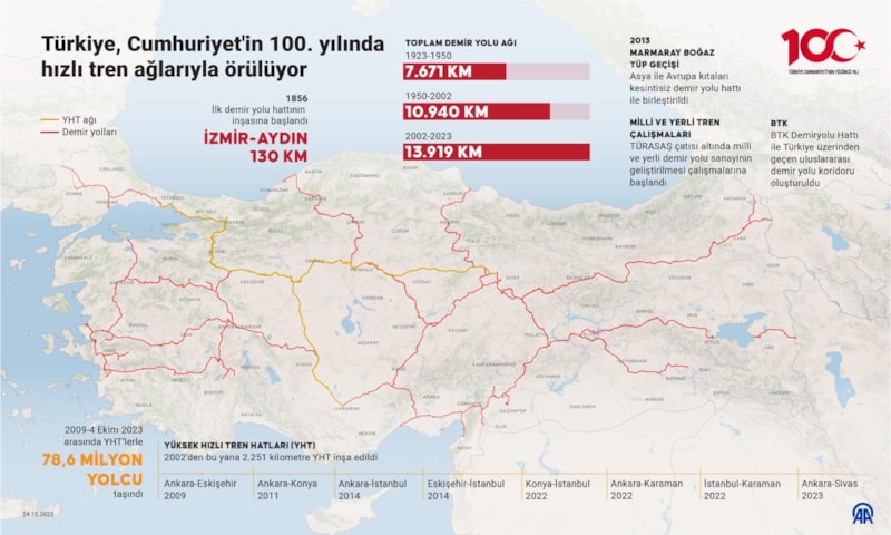 Cumhuriyet'in 100. Yıl Dönümü'nde ise Türkiye'nin demir yolu hatları alanındaki atılımları ise dikkat çekiyor.