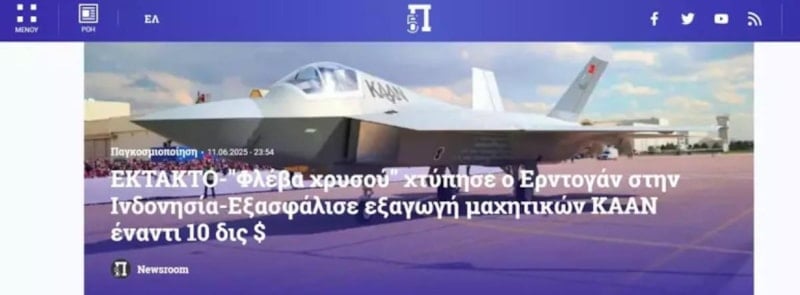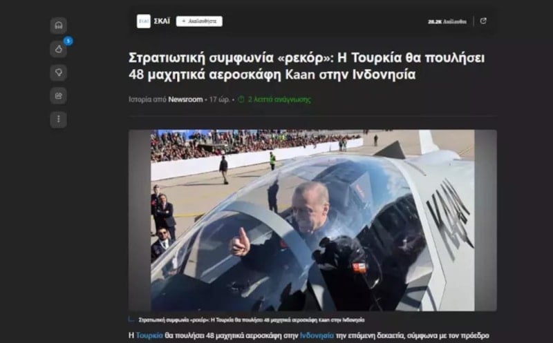 Yunanistan’ın önde gelen gazetelerinden Skai, Türkiye’nin Endonezya ile imzaladığı 48 adetlik KAAN savaş uçağı ihracatını “Rekor Askeri Anlaşma” başlığıyla duyurdu.