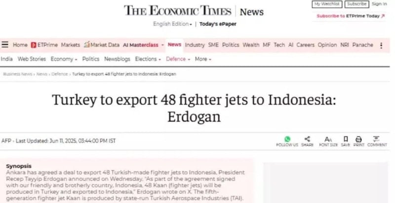 Hindistan merkezli The Economic Times, Türkiye ile Endonezya arasında imzalanan anlaşmaya yer verdiği haberinde, Türk savunma sanayiinin hızla güçlendiğini vurguladı.