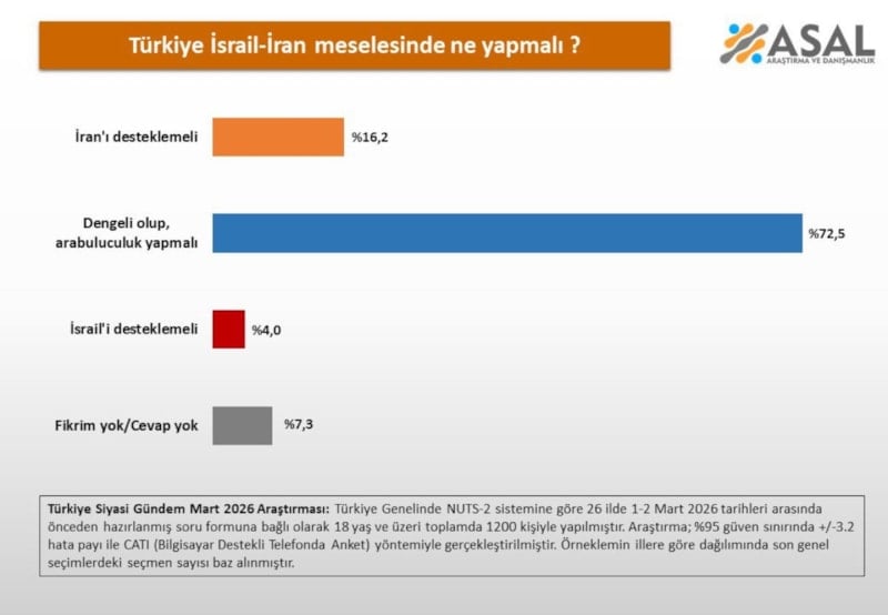 Asal Araştırma, 1-2 Mart tarihleri arasında yaptığı çalışmada, bin 200 kişiye "Türkiye İsrail-İran meselesinde ne yapmalı?" sorusunu yöneltti.