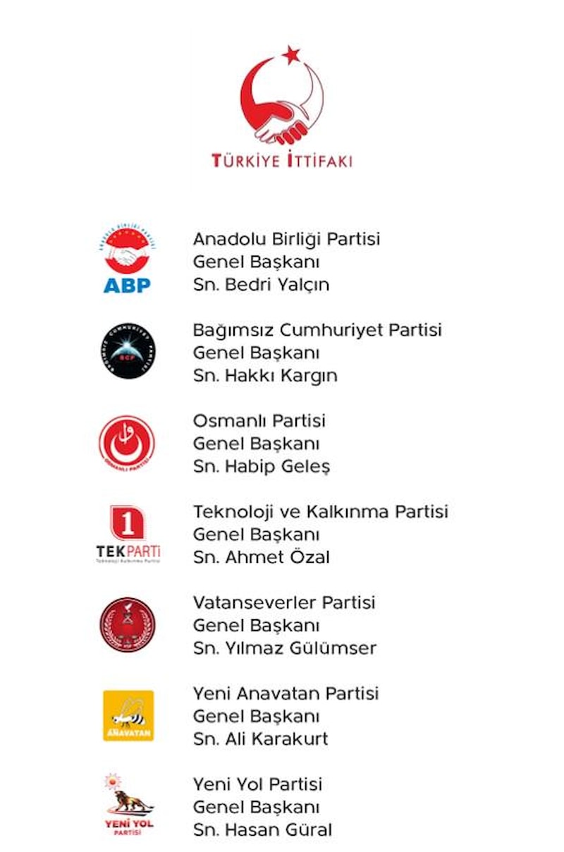 Anadolu Birliği Partisi, Büyük Türkiye Partisi, Ülkem Partisi, Osmanlı Partisi, Milli Parti, Aydınlığın Geleceği Partisi, Yeni Yol Partisi, Bağımsız Cumhuriyet Partisi, Vatan Severler Partisi ve Güç Birliği Partisi birleşerek "Türkiye İttifakı"nı kurdu.