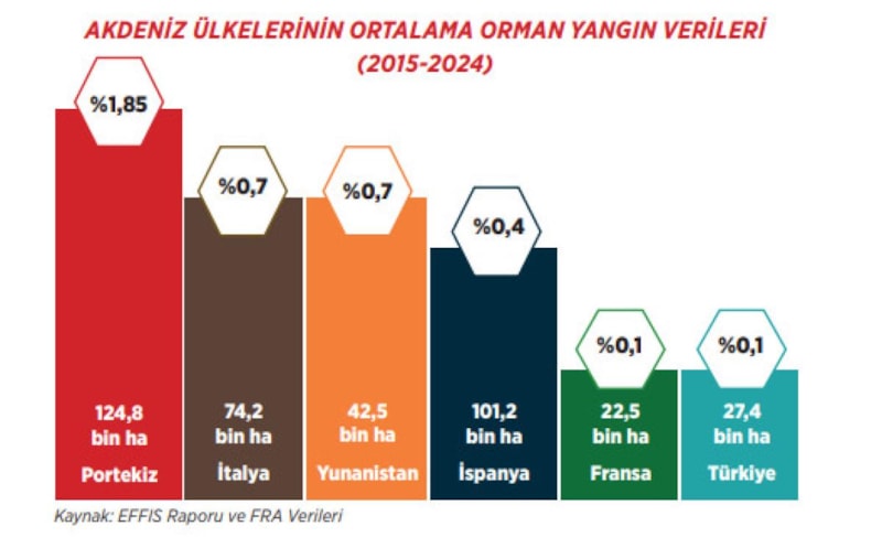EFFIS Raporu ve FRA'da 2015-2024 yılları arasında Akdeniz ülkelerinin ortalama orman yangın verileri paylaşıldı. Türkiye, rapordaki sonuçlara göre orman yangınlarınla mücadelede birinci ülke olarak öne çıktı.