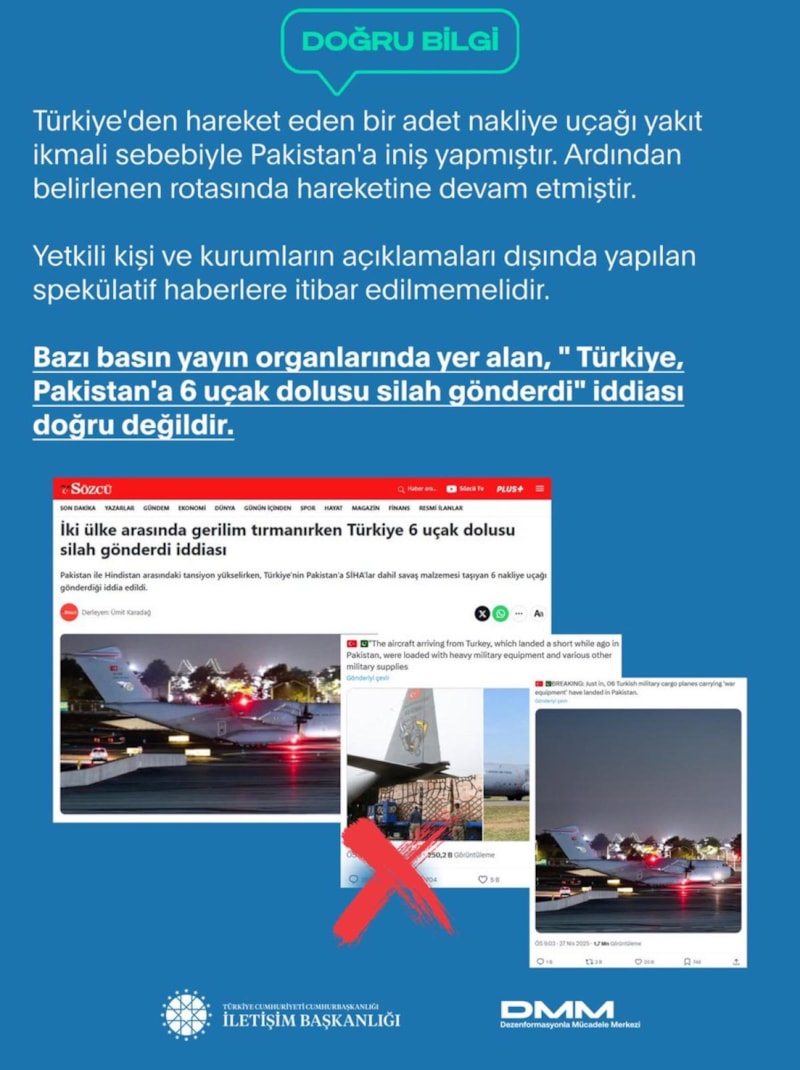 'Türkiye, Pakistan'a 6 uçak dolusu silah gönderdi' iddiası sonrası açıklamada bulunan DMM, söz konusu iddiaları yalanlayarak “Bazı basın yayın organlarında yer alan ‘Türkiye, Pakistan'a 6 uçak dolusu silah gönderdi' iddiası doğru değildir" dedi.