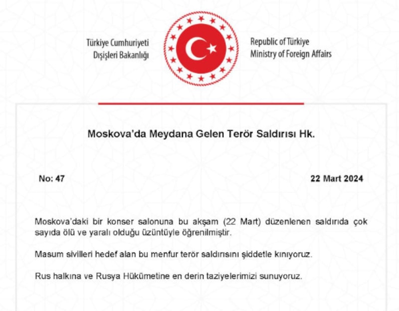 Dışişleri Bakanı Hakan Fidan, Türkiye'nin saldırıyı kınadığını ve Cumhurbaşkanı Erdoğan'ın Türk halkı adına Rusya'ya başsağlığı mesajını ilettiğini açıkladı.