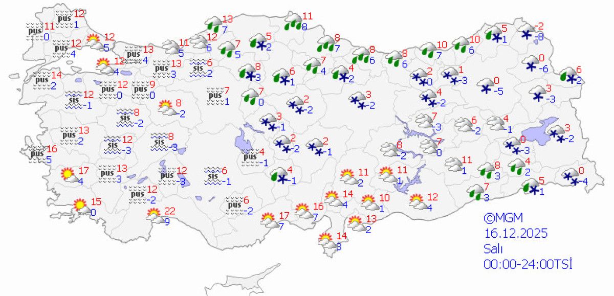 - Meteoroloji verilerine göre, ülkenin kuzey ve iç kesimlerinde yoğun sis ve karla karışık yağmur bekleniyor.
