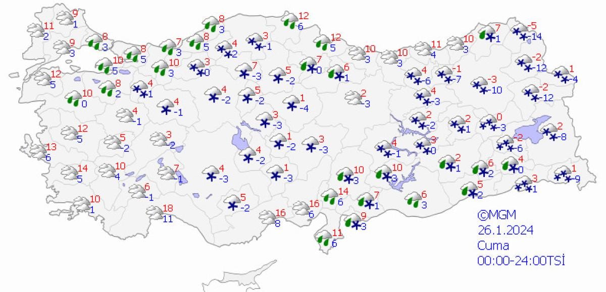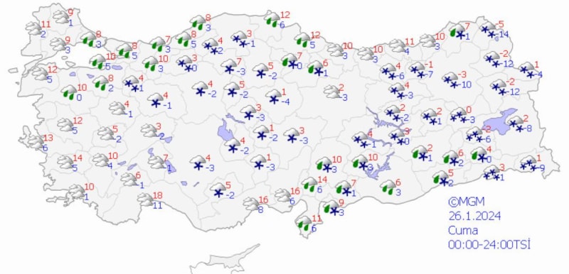 Şahbaz, cuma günü İç Anadolu'da Sivas dışında hafif şiddette kar yağışlarının görüleceğini dile getirerek, "Doğu Anadolu'da, Güneydoğu Anadolu'da ve Doğu Karadeniz iç kesimlerinde yağışlar görülecek. Yüksek kesimlerdeki yağışlar genellikle kar şeklinde olacak. Alçak kesimlerde ise yağmur şeklinde yağış bekliyoruz" diye konuştu.