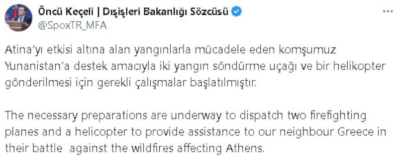 Dışişleri Bakanlığı Sözcüsü Öncü Keçeli, Yunanistan'ın başkenti Atina'da çıkan yangıların söndürülmesine destek amacıyla iki yangın söndürme uçağı ve bir helikopterin gönderilmesi için çalışmaların başlatıldığını açıkladı.