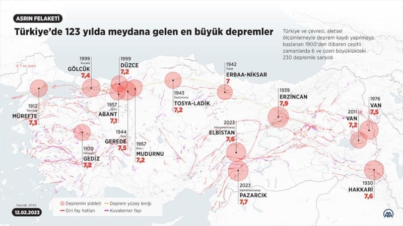 Son yaşadığımız Kahramanmaraş depremi bir ilk değil. Türkiye ve çevresi, aletsel ölçümlemeyle deprem kaydı yapılmaya başlanan 1900'den itibaren çeşitli zamanlarda 6 ve üzeri büyüklükteki 230 depremle sarsıldı.
