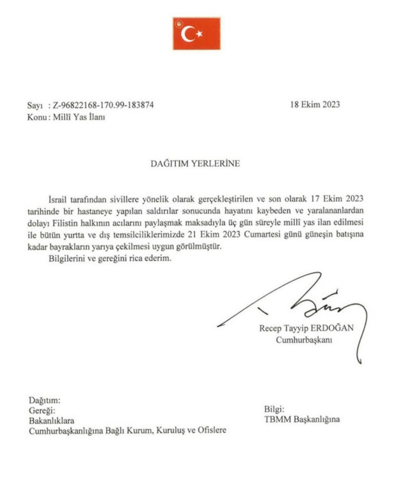 Cumhurbaşkanı Recep Tayyip Erdoğan, İsrail'in Filistin saldırıları nedeniyle 3 günlük milli yas ilan edildiğini duyurdu.