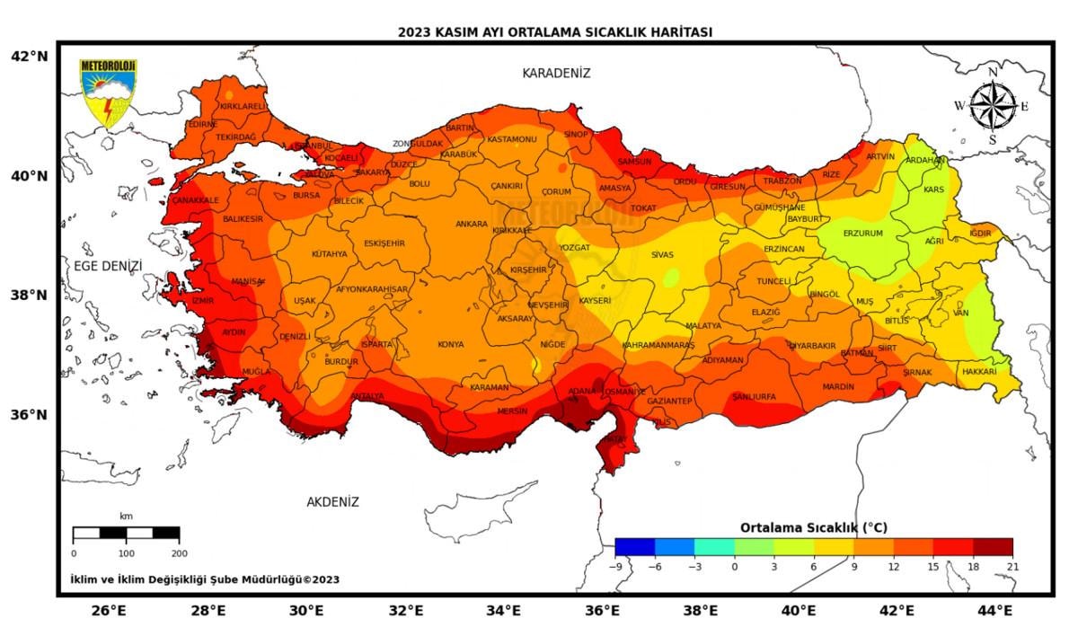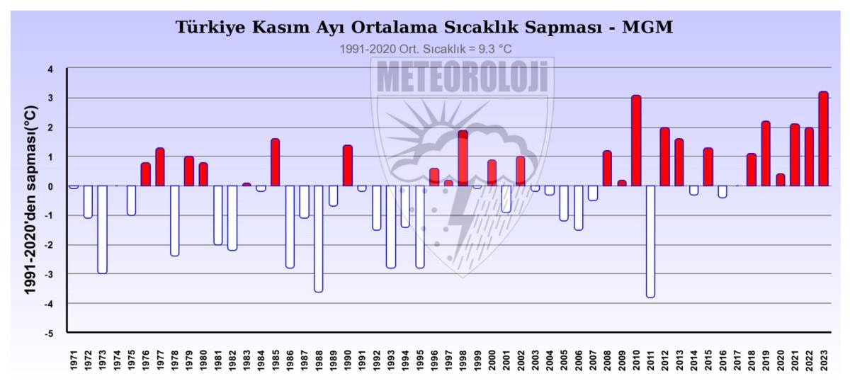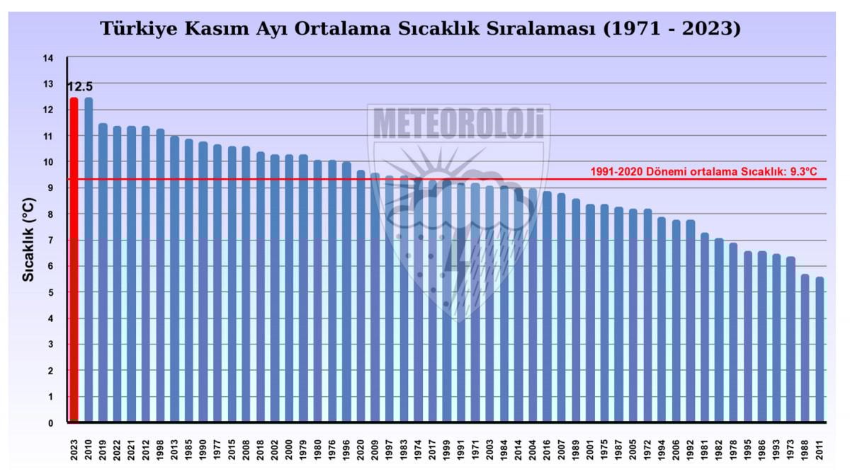 Meteoroloji Genel Müdürlüğü verilerine göre 1991-2020 normalleri kasım ayı ortalama sıcaklığı 9,3 derece olan Türkiye'de 2023 Kasım ayı sıcaklığı 12,5 derece ile normallerinin 3,2 derece üzerinde gerçekleşti.