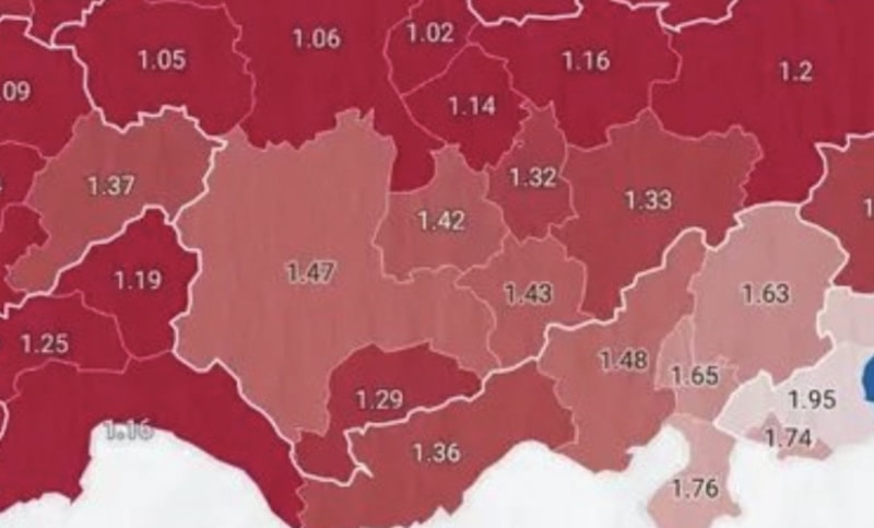Toplam doğurganlık hızı, ülke genelinde nüfusun kendini yenileyebilmesi için gereken 2,1 seviyesinin belirgin biçimde altına geriledi.