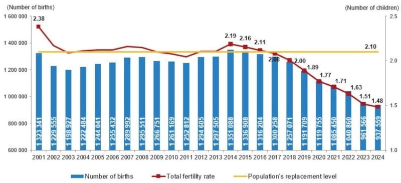 Türkiye’de yıllık doğum sayısı 2001 yılında yaklaşık 1 milyon 323 bin seviyesindeyken 2024 itibarıyla 937 bine kadar geriledi.