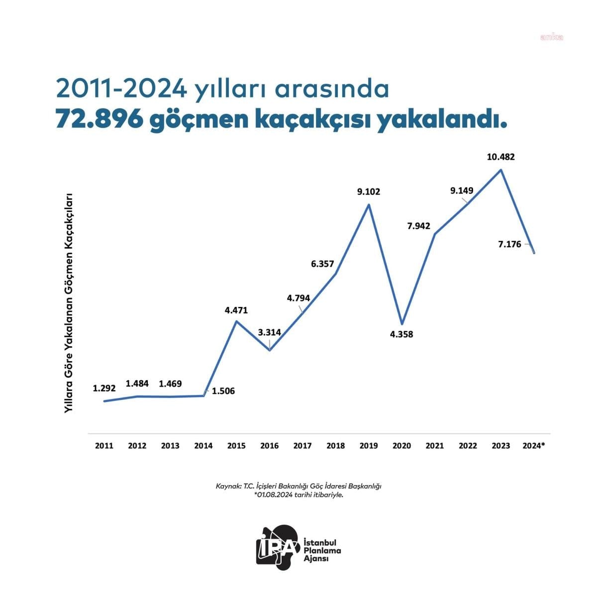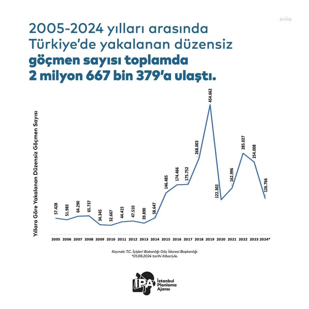 Buna göre, 2005-2024 yılları arasında Türkiye’de toplam 2 milyon 667 bin 379 düzensiz göçmen yakalandı.