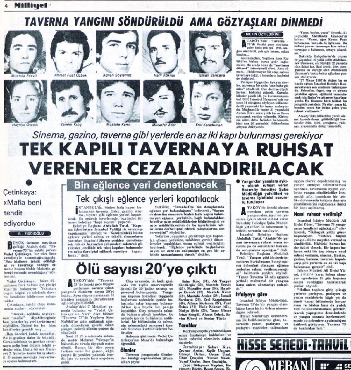 İstanbul'daki Ataköy C Motellerindeki "Vedat Çetinkaya'nın Yeri adlı tavernada gece saat 21.30 sıralarında çıkan yangında 21 kişi can verdi. Onlarca kişi yaralandı.