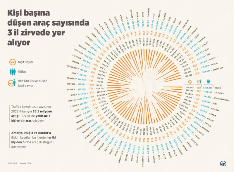 TÜİK verilerine göre nüfusa ve illere göre trafiğe kayıtlı araç ve her 100 kişiye düşen taşıt sayısı şöyle: