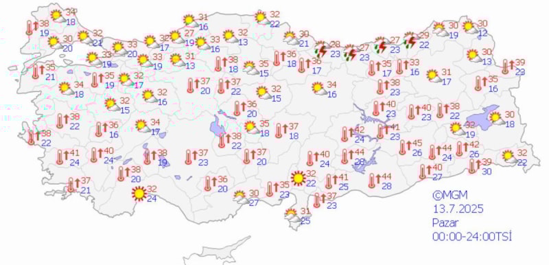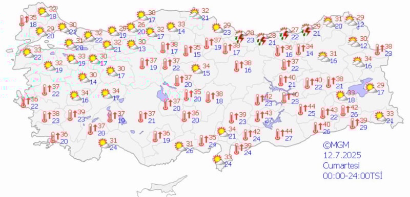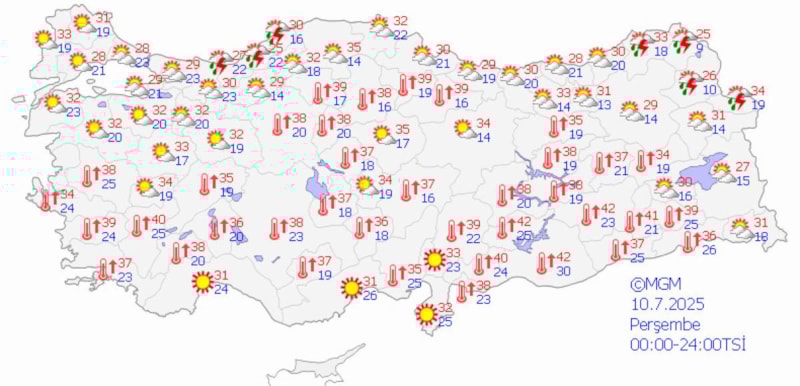 Meteoroloji Genel Müdürlüğü'nün 5 günlük hava tahmini raporlarına göre, Türkiye genelinde 10 Temmuz itibarıyla sıcaklıklar oldukça yüksek seyrediyor.