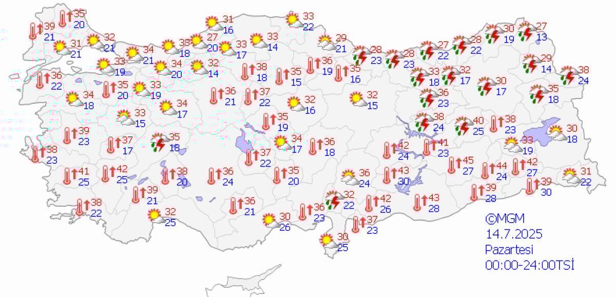 Özellikle iç kesimlerde ve güneyde 35 derecenin üzerine çıkan değerler dikkat çekiyor.