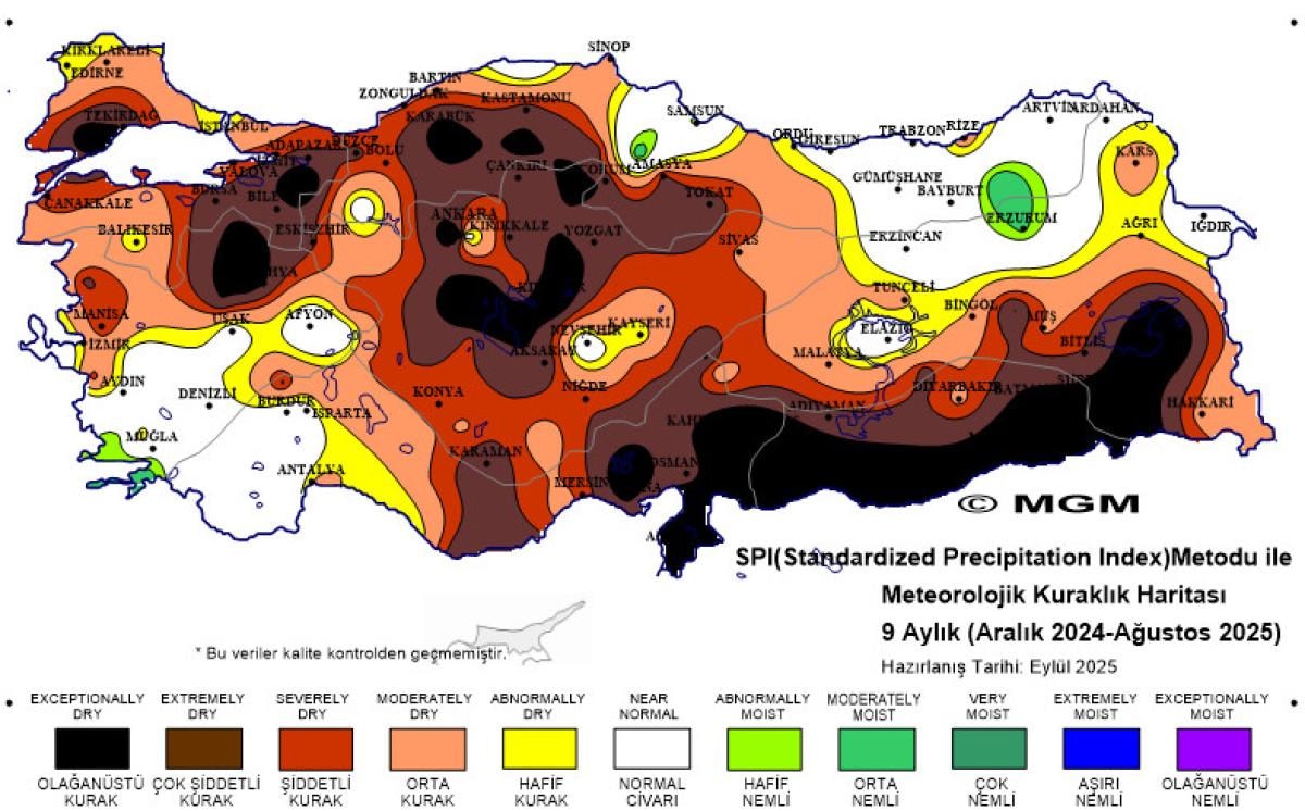 Haritaya göre, Türkiye’nin büyük bölümünde ''şiddetli ve olağanüstü kuraklık'' yaşanırken, yalnızca Karadeniz’in doğusu ile bazı sınırlı bölgelerde nemli ve normal değerler kaydedildi.