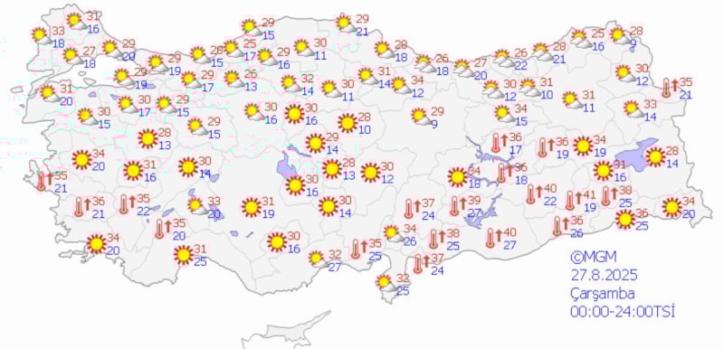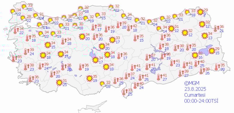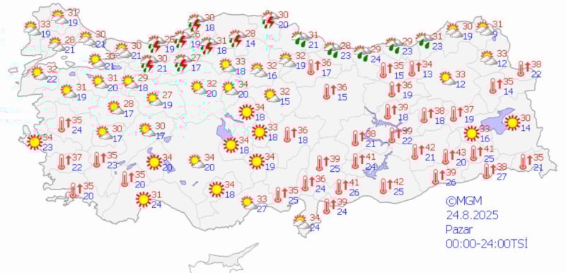 24 Ağustos Pazar günü sıcaklıklar batıda 33 derece, iç kesimlerde 38 derece, doğu ve güneydoğu bölgelerinde 37 derece civarında seyredecek.