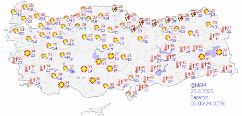 Pazartesi (25 Ağustos) günü hava sıcaklıkları batıda 32 derece, iç kesimlerde 36, doğu ve güneydoğu bölgelerinde 35 derece düzeylerinde ölçülecek.