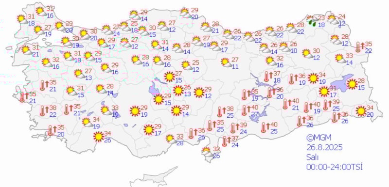 26 Ağustos Salı günü ise batıda 31 derece, iç kesimlerde 34 derece, doğu ve güneydoğu bölgelerinde 33 derece civarında olacak.