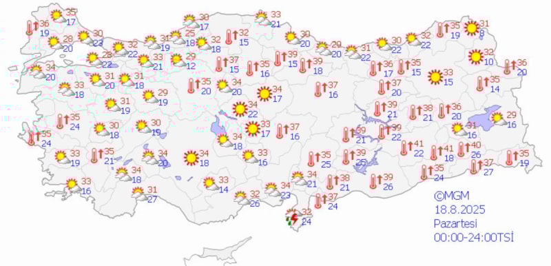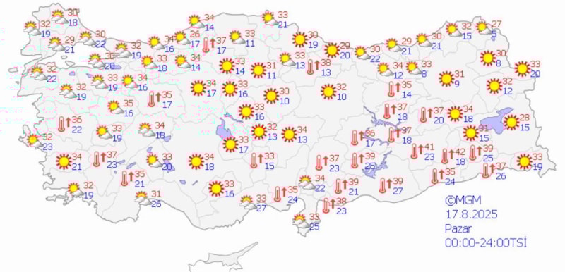 Bugün, 17 Ağustos Pazar günü, sabah saatleri itibarıyla sıcaklıklar iç kesimlerde ve güneyde 35-38 dereceye ulaşırken, kuzey ve batı bölgelerinde 30-34 derece arasında değişiyor.