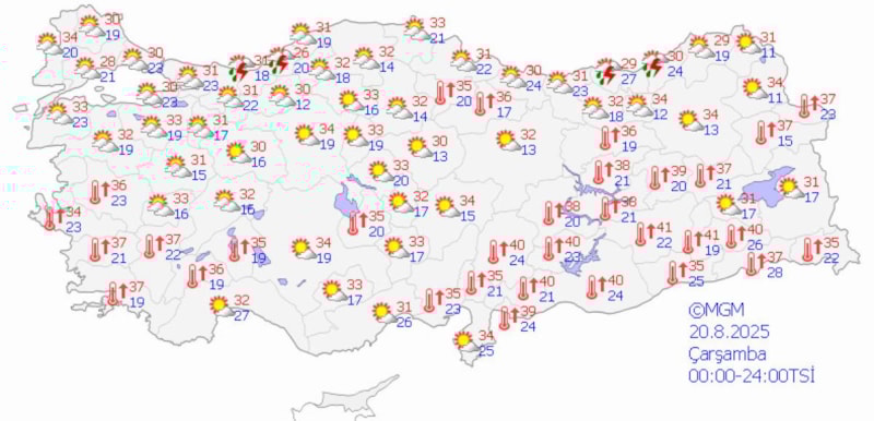 Salı günü ise doğu bölgelerinde 37-39 dereceye kadar çıkabilecek sıcaklıklar dikkat çekerken, Karadeniz kıyılarında 20-25 derece ile daha serin bir hava hakim olacak.