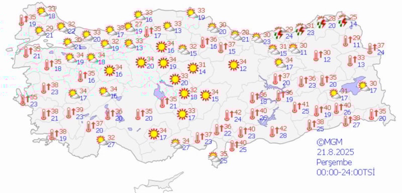 Meteoroloji Genel Müdürlüğü'nün 17-21 Ağustos 2025 tarihleri arasındaki 5 günlük hava durumu tahmin haritalarına göre, ülke genelinde sıcak hava dalgası etkili olmaya devam ediyor.