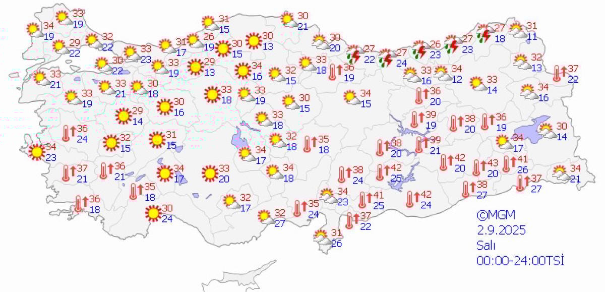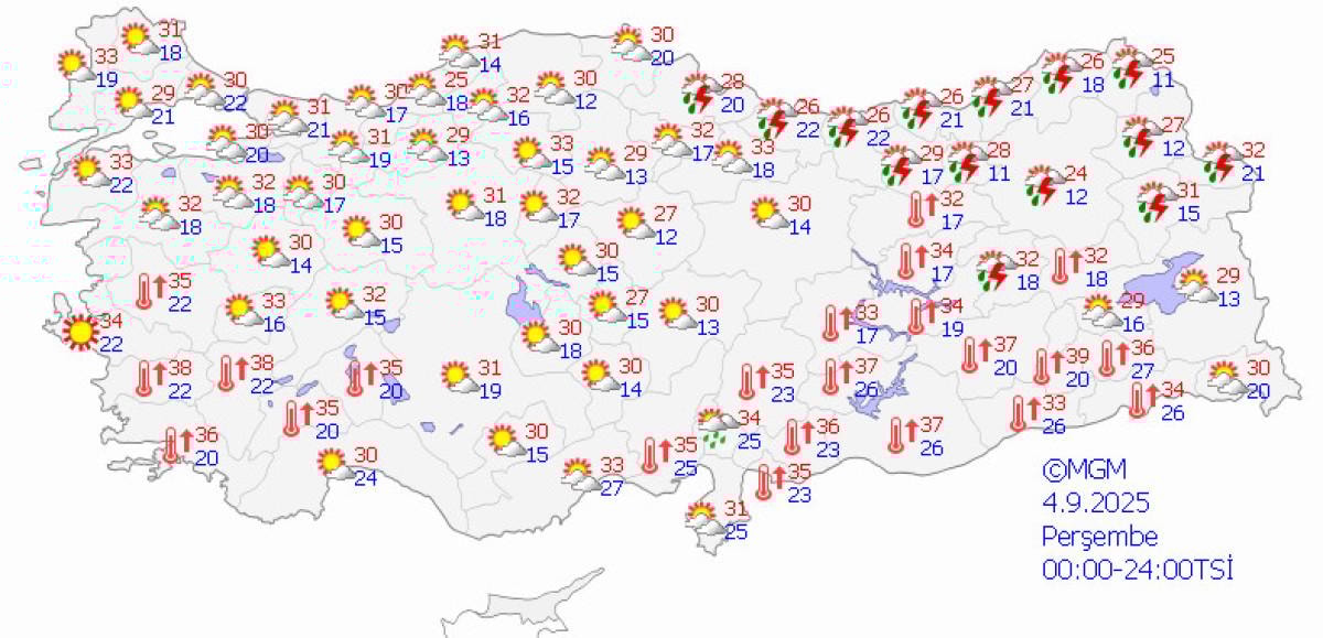 Bugün sabah saatlerinde iç kesimlerde ve güney bölgelerde hala 35-38 dereceye varan sıcaklıklar gözlemlenirken, kuzey ve batı bölgelerde bu değerler 20-30 derece aralığına geriledi.