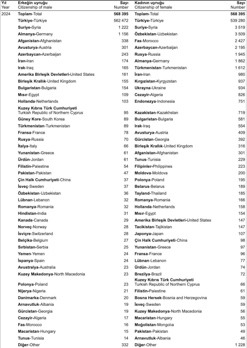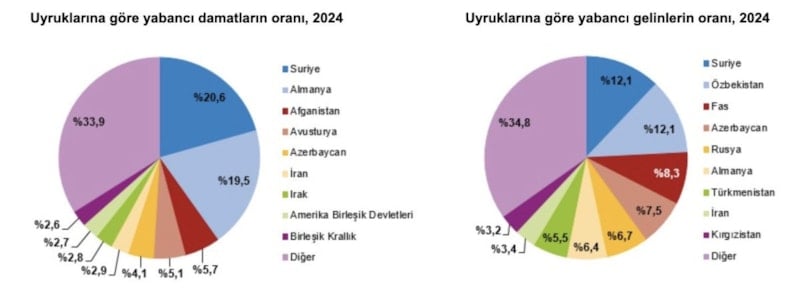 Yabancı gelinler uyruklarına göre incelendiğinde, yabancı gelinler içinde yüzde 12,1 ile Suriyeli ve Özbek gelinler birinci sırada yer aldı. Bu gelinleri yüzde 8,3 ile Faslı gelinler ve yüzde 7,5 ile Azerbaycanlı gelinler izledi.