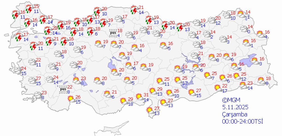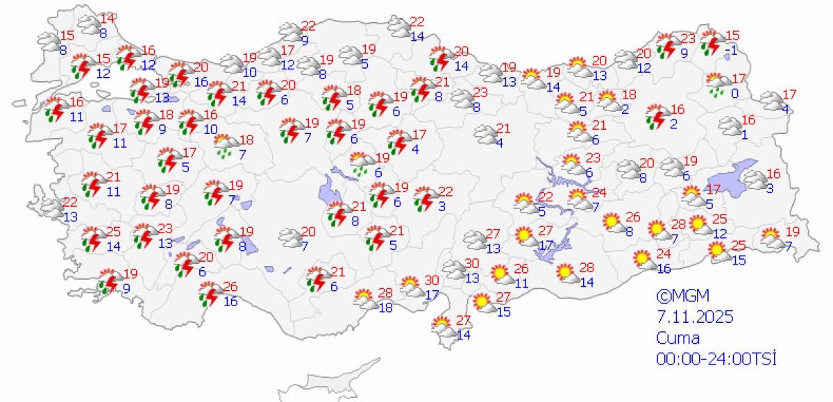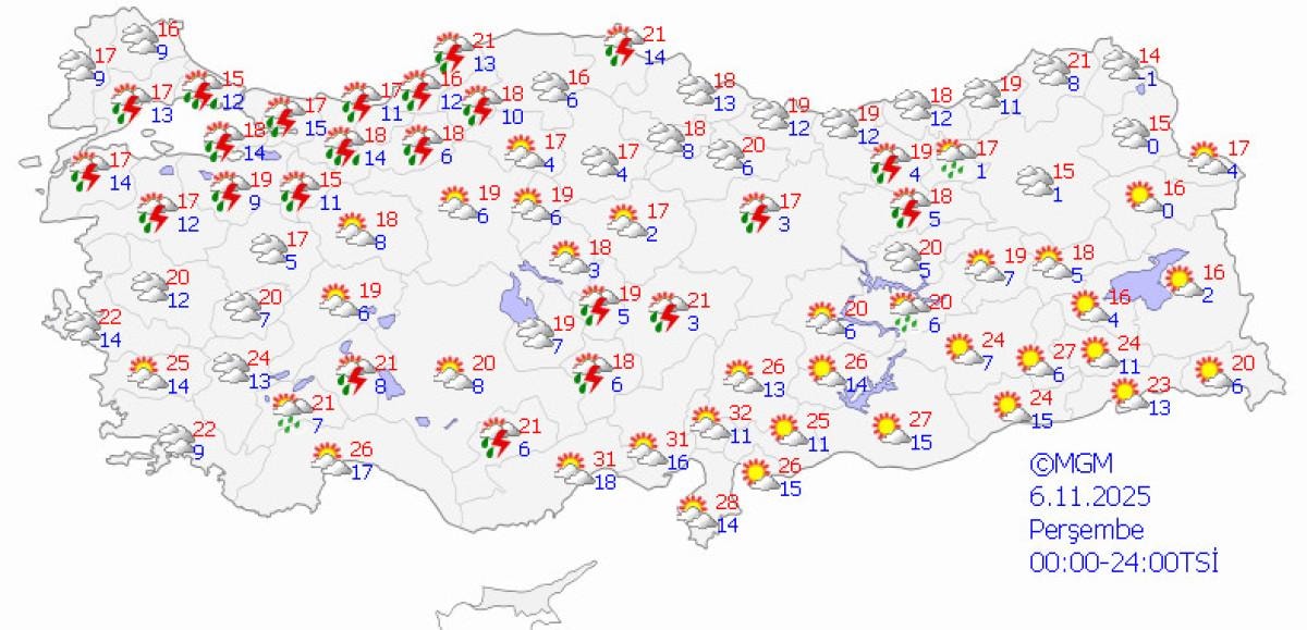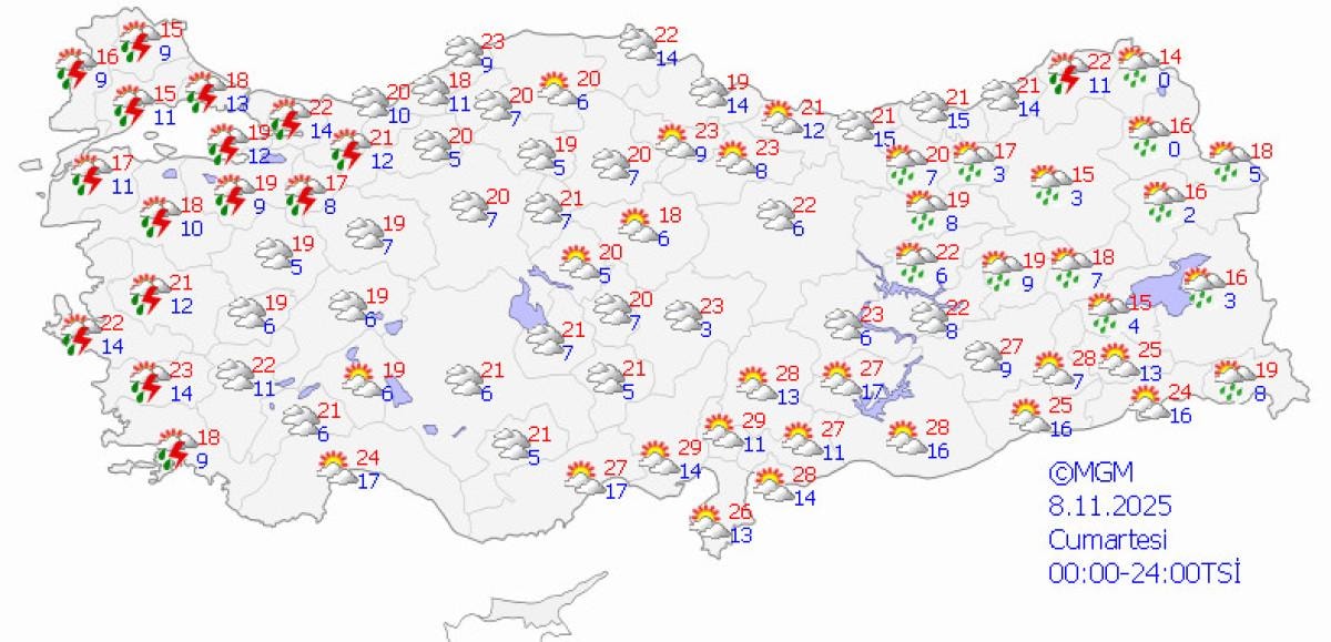 Ülke genelinin büyük ölçüde parçalı ve yer yer çok bulutlu geçeceği tahmin edilirken, özellikle Marmara, Ege, İç Anadolu'nun doğusu, Batı Karadeniz ve Doğu Anadolu'nun kuzey kesimlerinde aralıklı sağanak ve yer yer gök gürültülü yağışlar bekleniyor.