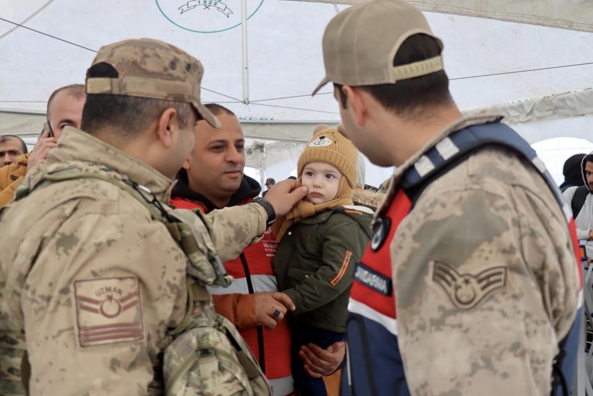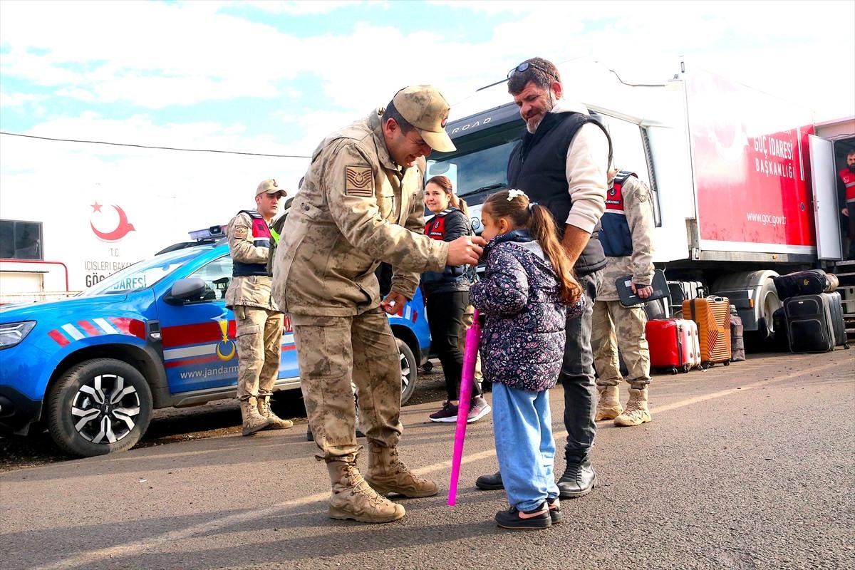 Sınır kapısında tedbir alan jandarma ekipleri, aileleriyle ülkelerine dönen Suriyeli çocuklara yakın ilgi gösteriyor.