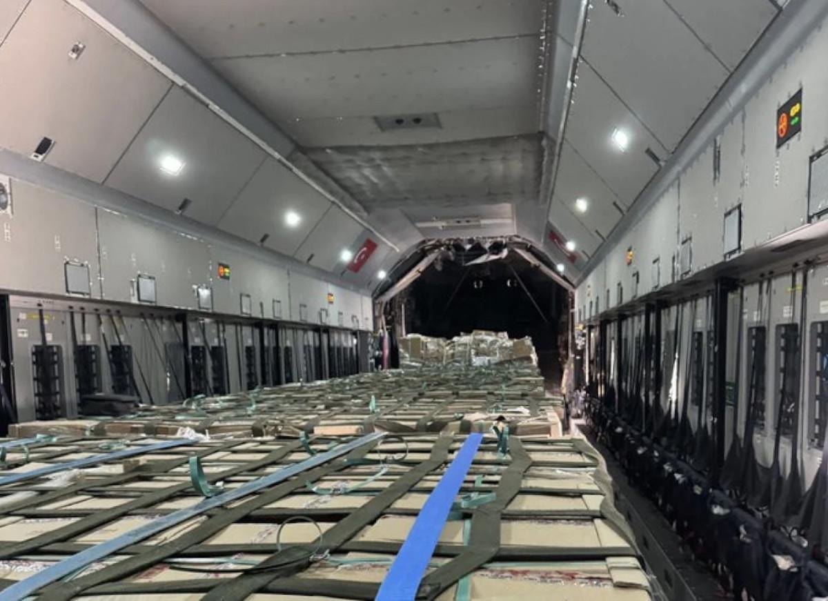Gazzeli kardeşlerimiz için hazırlanan 24 tonluk gıda malzemesi, Hava Kuvvetleri Komutanlığımıza ait A400M uçağı ile Ürdün’deki Marka Uluslararası Havalimanı'na ulaştırıldı.
