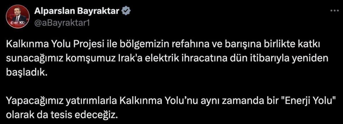 Sosyal medya hesabı X üzerinden konuya ilişkin paylaşımda bulunan Bayraktar, "Kalkınma Yolu Projesi ile bölgemizin refahına ve barışına birlikte katkı sunacağımız komşumuz Irak'a elektrik ihracatına dün itibarıyla yeniden başladık. Yapacağımız yatırımlarla Kalkınma Yolu'nu aynı zamanda bir 'Enerji Yolu' olarak da tesis edeceğiz." ifadelerini kullandı.