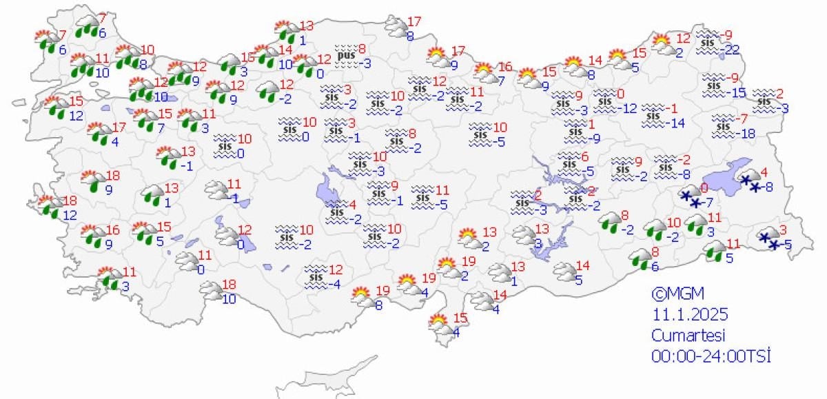 Meteoroloji Genel Müdürlüğü tarafından yapılan son tahminlere göre: Ülkemiz genelinin parçalı yer yer çok bulutlu, Marmara, Ege (Afyonkarahisar hariç), Batı Karadeniz, Güneydoğu Anadolu'nun doğusu, Şırnak çevrelerinin yağmur ve sağanak, Bitlis, Van ve Hakkari çevrelerinin karla karışık yağmur ve kar yağışlı geçeceği tahmin ediliyor.
