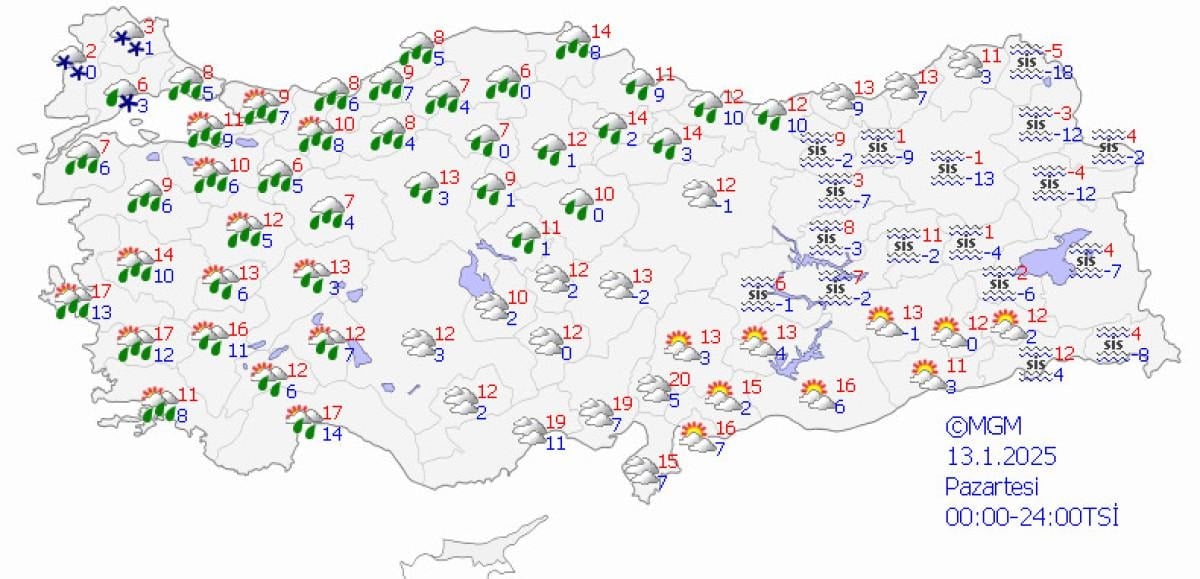 13 Ocak Pazartesi günü günü yurdun batısı ve kuzey batısı yağmurlu, güney doğusu parçalı bulutlu geçecek. Doğuda ise yoğun sis görülecek.