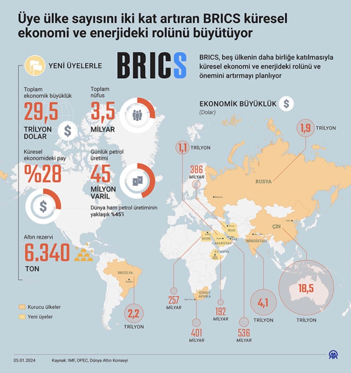 Uluslararası Para Fonu (IMF) verilerine göre, bu yıl katılan beş yeni ülkeyle birlikte BRICS’in ekonomik büyüklüğü 29,5 trilyon doları geçerken, küresel ekonomideki payı da yüzde 28’e çıktı.