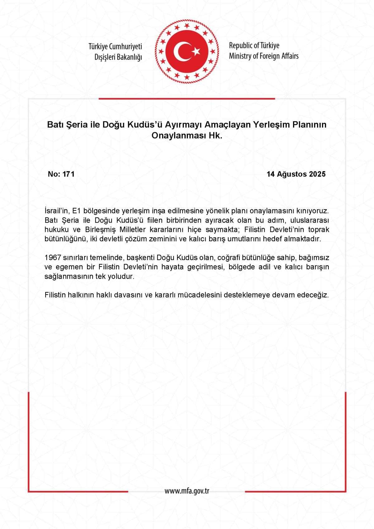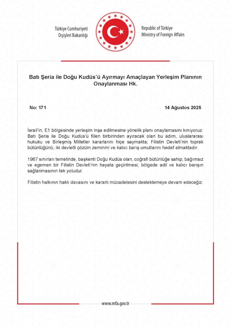 Yayımlanan ortak açıklamada, İsrail Başbakanı Binyamin Netanyahu’nun "Büyük İsrail" söylemleri ile aşırı sağcı bakan Bezalel Smotrich’in E1 bölgesindeki yerleşim planına ilişkin ifadeleri, uluslararası hukukun açık ihlali olarak nitelendirildi.